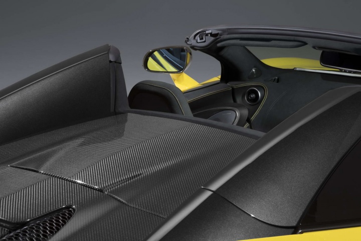 Taking learnings from the 650S and 675LT Spiders, the roof is a two-piece affair made of composite panels and thus the overall weight gain of the convertible 570S is a mere 46kg. Additional 570S Spider specifics include a glazed wind deflector/rear screen aft of the cabin that can be raised and lowered independent of the roof, and an extended rear spoiler that also sits 12mm higher than on the Coupe, to compensate for the altered body shape.