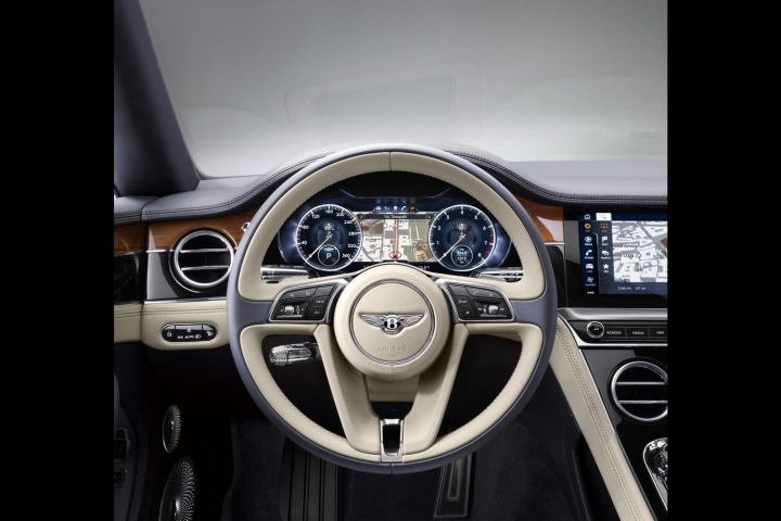 Inside, the cabin is entirely new and a massive improvement on the outgoing car's interior, with many more high-tech features. The traditional wood (now a sustainably-sourced Koa veneer), hand-polished chrome and knurled metal fittings remain, but there is now a new 'rotating display' that rolls out the big 12.3-inch central screen from a hidden position in the centre console. It has a fully customisable menu setup, but (just to show that Bentley hasn't lost sight of tradition) also has three analogue dials set into a third side of the rotating section. The instrument pack is also all-new, and now all-digital too.