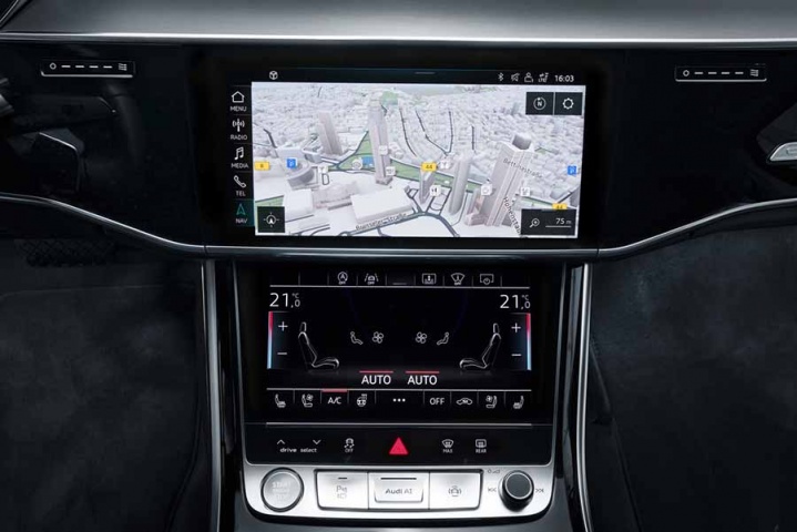 The new A8 features an impressive new interior that is virtually devoid of physical buttons. Instead, the majority of the usual functionality is controlled via two large touchscreens on the centre console. Ahead of the driver is the latest version of Audi's fully digital dashboard along with a detailed head-up display.