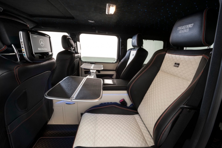 Inside, there is a mix of black and white leather with red piping, and a starry-sky headliner filled with tiny LEDs that mimic the effect of looking up at the Milky Way. Even the floor is lined with black leather, so make sure you wipe your boots before getting in.