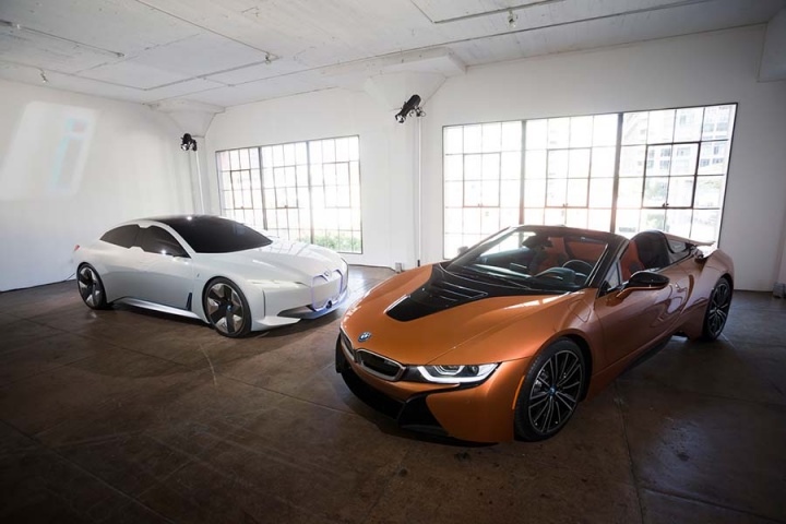 The two-seat i8 Roadster received its world premiere at the Los Angeles Auto Show and will hit world markets from May 2018, alongside an updated version of the i8 Coupe from which it has spawned. Using the i8's carbon-fibre tub means there's little that needs to be done to strengthen the Roadster, although BMW does talk of model-specific structural elements to brace the open-top i8. The roof is made of fabric and can be lowered or raised in just 15 seconds, even while on the move at speeds of up to 50km/h, while a windscreen frame made from carbon fibre-reinforced plastics (CFRP) help to keep the weight penalty over an i8 Coupe to a reasonable 60kg.