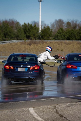 Yup, BMW refuelled one drifting M5 from another drifting M5 while a crew member - Detroit Speed's Matt Butts, and yes he was wearing all kinds of safety harnesses - dangled out the window holding the fuel pump in place. The second M5 was driven by BMW Performance Centre Chief Driving Instructor Matt Mullins.