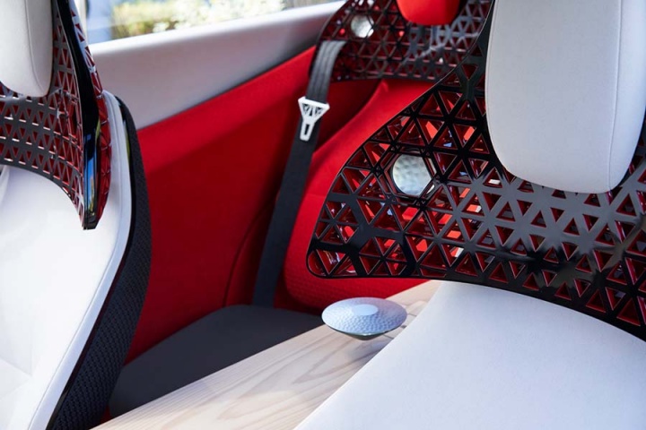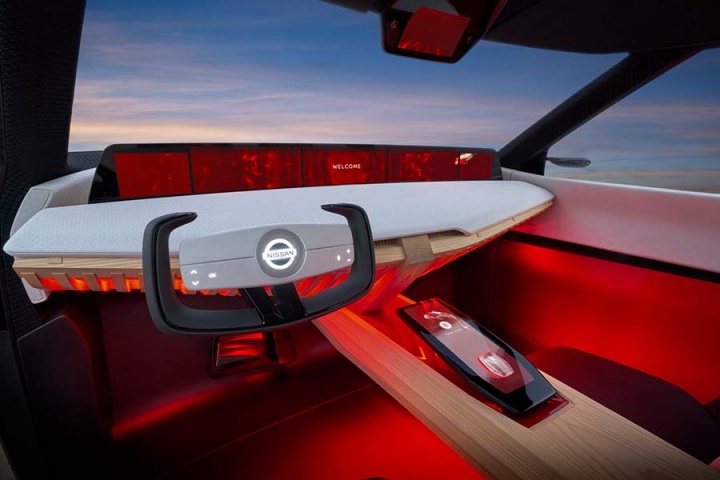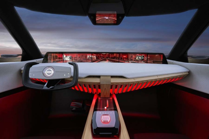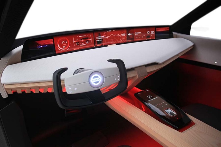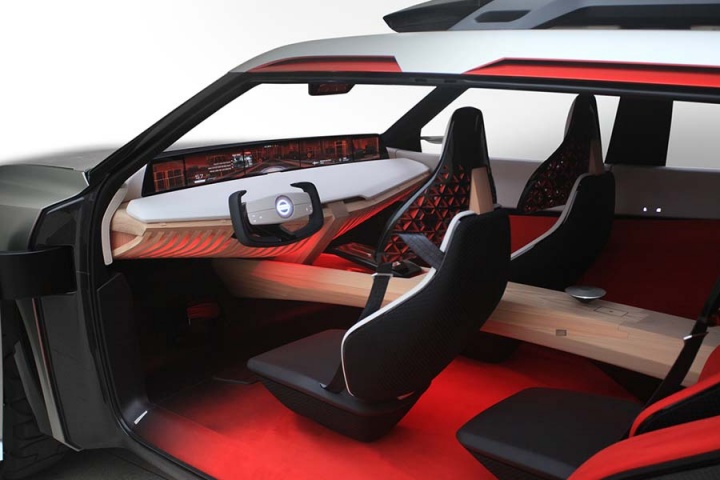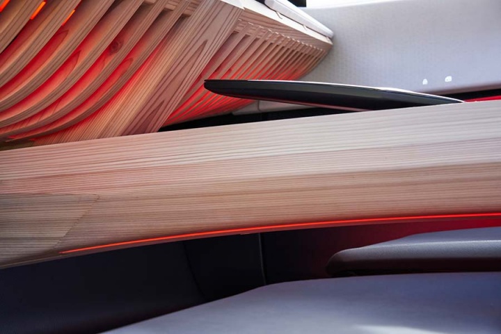 And staying onboard the Xmotion, the interior - accessed by a pair of opposing-opening doors - is said to be a modern interpretation of traditional 'kigumi' wood joinery. But it's not old-fashioned inside; seven digital screens are arrayed around the Nissan's cabin, five spanning the width of the instrument panel while a 'digital room mirror' on the ceiling (no pink champagne on ice, though...) and a centre console display round out the visual hardware. Nissan also says the Xmotion's displays and infotainment can be controlled by hand gestures and eye movements, while the latest in new-generation Nissan Intelligent Mobility is also drafted into the spec sheet.