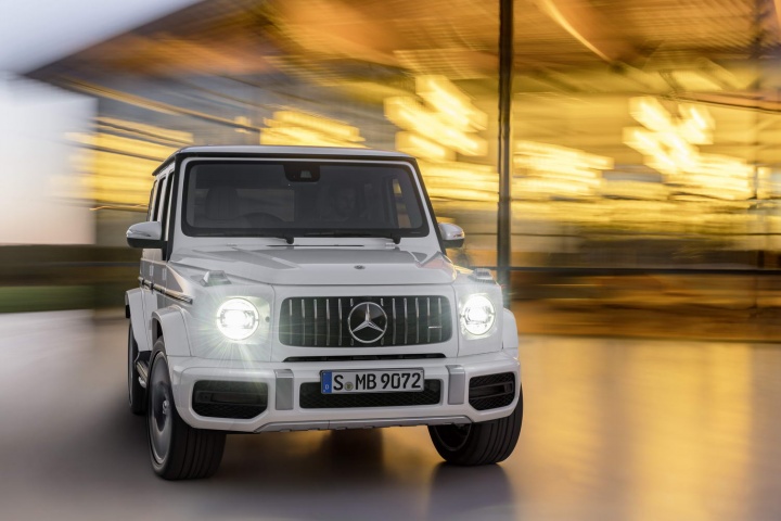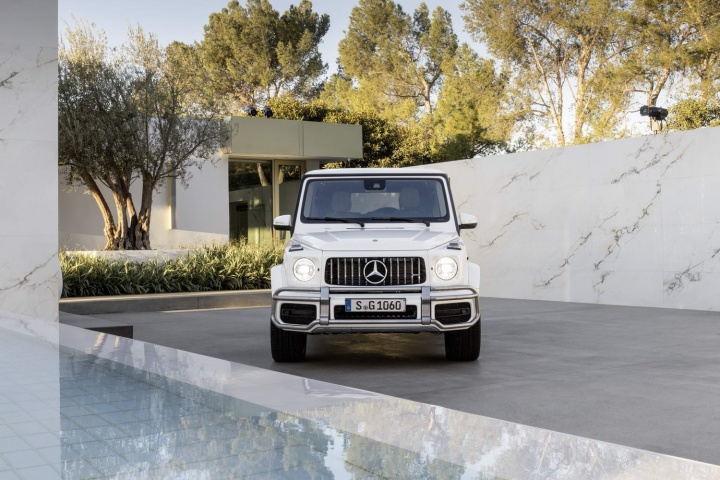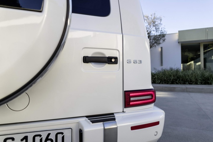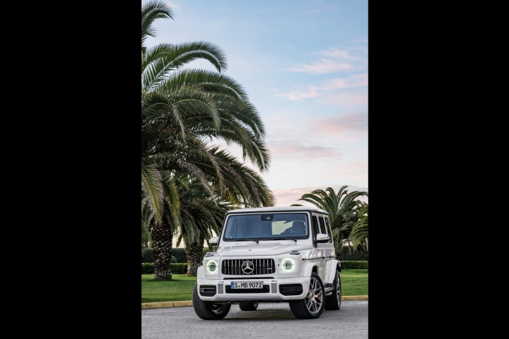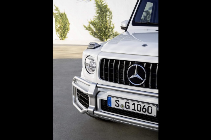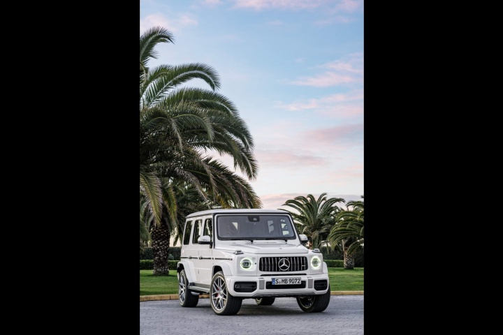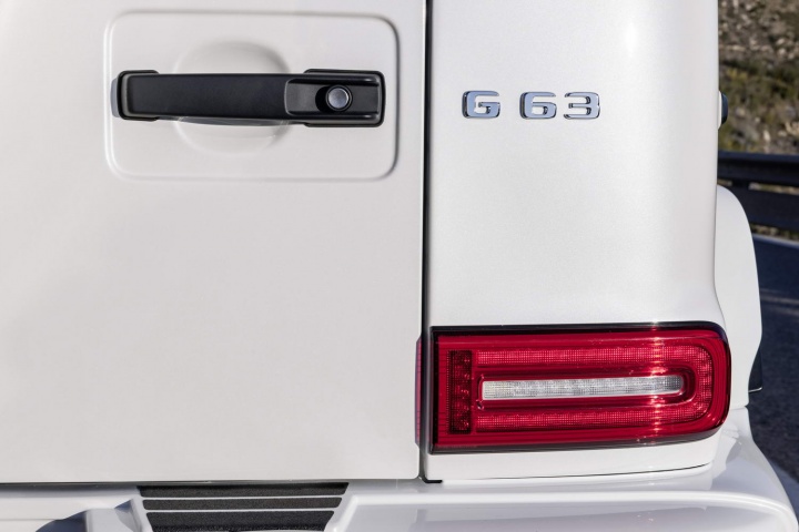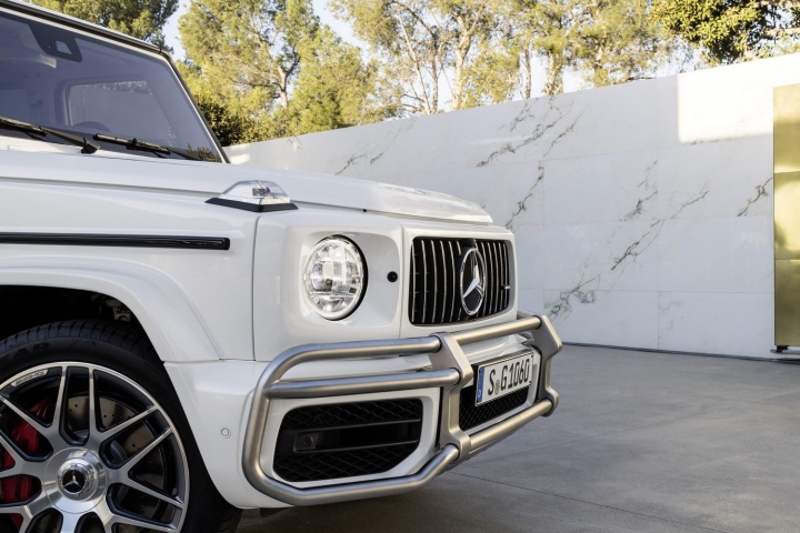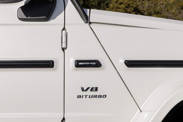 Like any AMG, the G-Class gets the traditional signifiers of this performance marque - such as an AMG-specific radiator grille, AMG bumpers and lower front air intake, flared wheel arches, 'V8 Biturbo' badging, red brake callipers and alloy wheels of 21 or 22 inches in size. Options will include the AMG Night Package, which tints the headlamps, taillights, indicator lenses and all the glasshouse aft of the B-pillar in a darker shade. More black is then used on further details to complete the look.