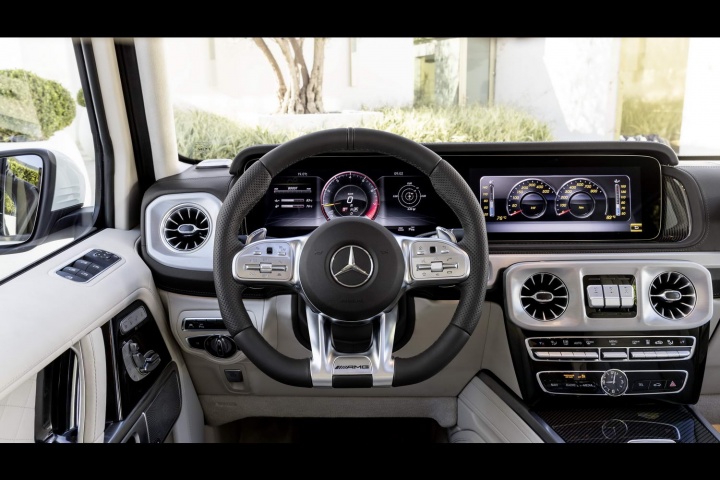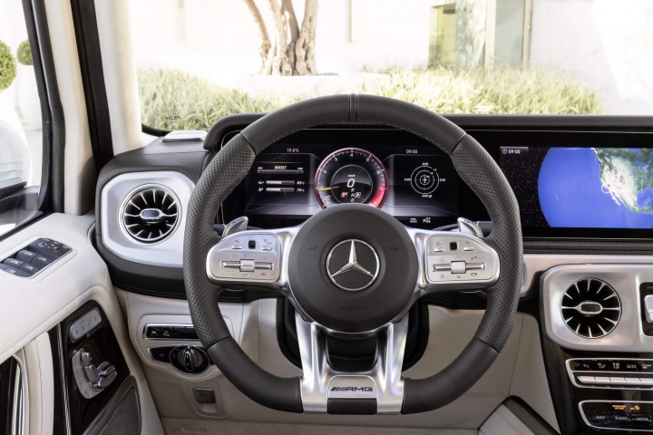 More AMG giveaways are to be spotted within the G 63, although your eyes might first be drawn to the (optional) fully digital Widescreen Cockpit with virtual instrumentation. This is a feature drawn from the E- and S-Class siblings, and it sees two 12.3-inch TFT displays presented behind a single glass cover. Those AMG hallmarks, by the way, include a new AMG Performance steering wheel in Nappa leather, which is flat-bottomed and now features both touch-sensitive infotainment control pads and the buttons for the cruise control/Distronic active cruise.