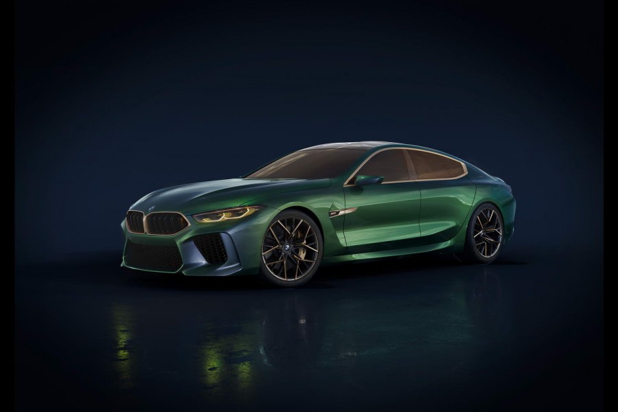 Finally, the whole Concept M8 Gran Coupe is finished in Saleve Vert, a hue that shifts from green to greyish-blue in certain lights. Contrasting that are gold details, around the kidney grilles at the front, for the window surrounds in profile, for the M gills on the front wings, for the brake callipers and the alloy wheel highlights, and on the four exhaust finishers at the rear.
