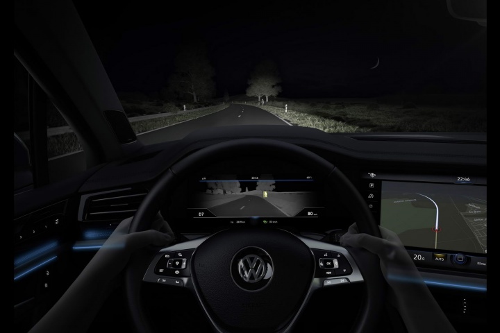 Volkswagen is making an arsenal of safety systems and driver assistance technology available on the Touareg, some which will be standard and others optional. A first in a Volkswagen is the Night Vision system. Through a built-in infrared camera, it can detect animals and people at night and can highlight their presence to the driver on the screen in green or red according to the risk level. This system can link in with the Brake Assist to pre-condition the brakes in anticipation of the need to stop. Additionally, with the new LED matrix headlights, any person in potential danger will be illuminated by a sudden flash to warn both them and the driver.