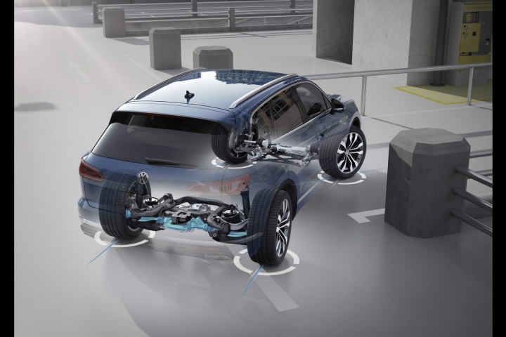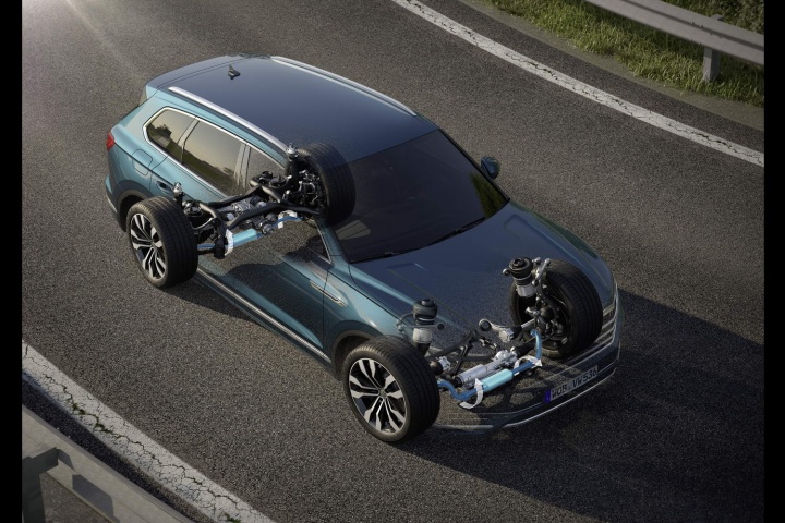 Moving on to the underpinnings, as standard the Touareg gets a MacPherson strut set-up at the front with five-link suspension rear. Much of this is made of aluminium to keep weight down, but full air suspension will be offered, as will the active anti-roll bar set-up with a 48-volt power supply that has been used on the Audi SQ7 and Bentayga models we've already mentioned. This uses electromechanical anti-roll bars on both axles, with a central control unit managing how they operate to keep the Touareg's body stable at all times.
