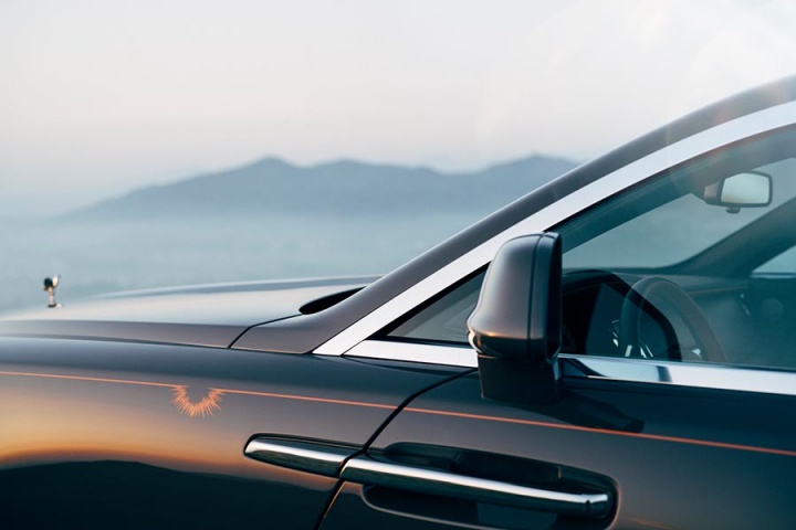 The "Collective" has added a number of exclusive and fun little visual touches, the most obvious being the new paint. The colour "Sunburst Grey" is inspired by, according to Rolls-Royce "the heady shade of the golden hour's sunrays" and describes it as a "flat grey that enlivens when awoken by the sun, rich copper tones, emitting a deep emotive warmth". A hand-painted sunburst-motif coachline runs along the length of the car and the channel lines on the bonnet and pinstripes on the wheel centres are finished in "Saddlery Tan" which carries-through from the colour of the interior leather.