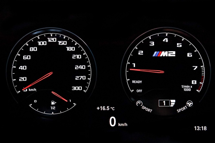 There has been a subtle restyling of the dashboard to include the latest BMW 2 Series upgrades and the M2's instruments now use 'black panel' technology to give them a more contemporary look. The steering wheel features M1 and M2 mode buttons now, complemented by new buttons to directly alter the steering and throttle settings on the centre console. There's also a bright red engine start button, as first seen in the BMW M5.