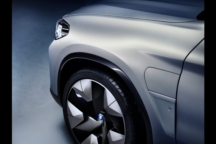 The Beijing concept is our first indication that BMW will visually differentiate the iX3 from regular BMW X3 variants. Blue accents on the BMW roundels and extra 'i' badging are complemented by aerodynamic new alloy wheels and bumpers, more blue trim at the rear and sides and a distinctive take on the BMW kidney grilles, which are blanked off of course, as there's no engine behind to cool. We expect most of these measures to make it through to production.