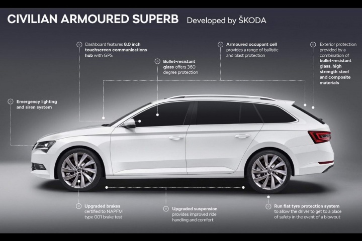 Following three years of planning, development and testing, the armoured Skoda Superb wagon is the result of a joint project between the Czech manufacturer and a UK-based conversion company.
