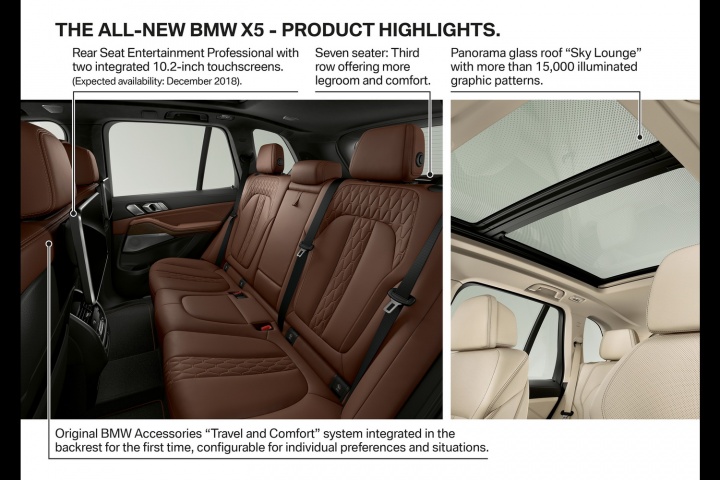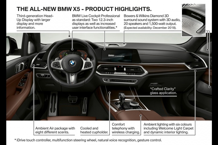 The new X5 will continue to offer a seven-seat option (or 5+2), despite the impending arrival of the larger X7 SUV, while it will be one of the first models in BMW's portfolio to get the company's new 'Live Cockpit Professional' dashboard as standard. This consists of two lovely, big 12.3-inch TFT screens, one in the instrument cluster with a fresh, angular design, and the other perched atop the dash for infotainment - which is powered by the latest iDrive 7 software. There's also a new version of BMW Head-Up Display with a larger surface projection to feast your eyes upon. All the usual luxury fittings and options, like ambient air, a panoramic roof, a Bowers & Wilkins Diamond 3D surround sound system, leather upholstery and more, will be offered, while there are some interesting practicality touches.