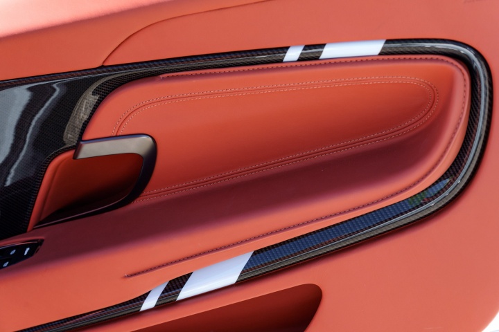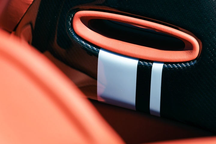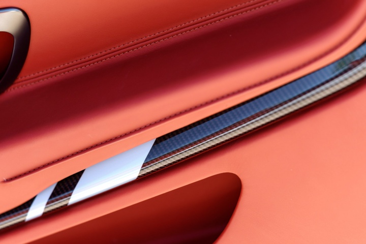 Inside, there is Red Oxide Caithness seats and trim, yet more carbon fibre, a stainless-steel crossed oars motif, and hand painted blue accents, which are "inspired by the rowing club markings found on the blades of rowers' oars."