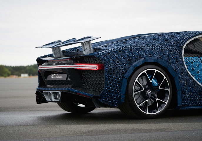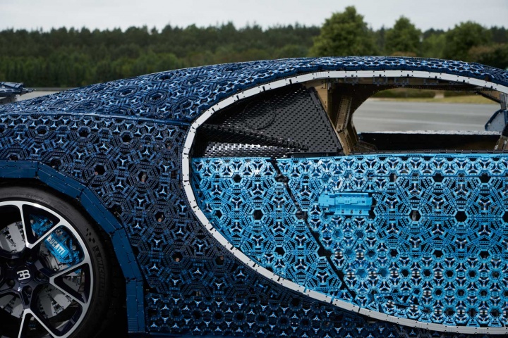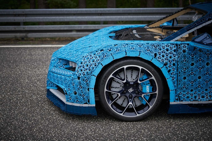 All of the Lego Chiron's rear spoiler, speedometer, front and rear lights, detachable steering wheel and brake pedal are formed from Technic elements, and all of them work - the only things on the model that aren't Lego are the wheels/tyres and badges, all of which are genuine Bugatti items lifted straight from the Chiron itself. In total, more than 339 different types of Lego Technic elements were used in the build process, which took 13,438 man hours to create.