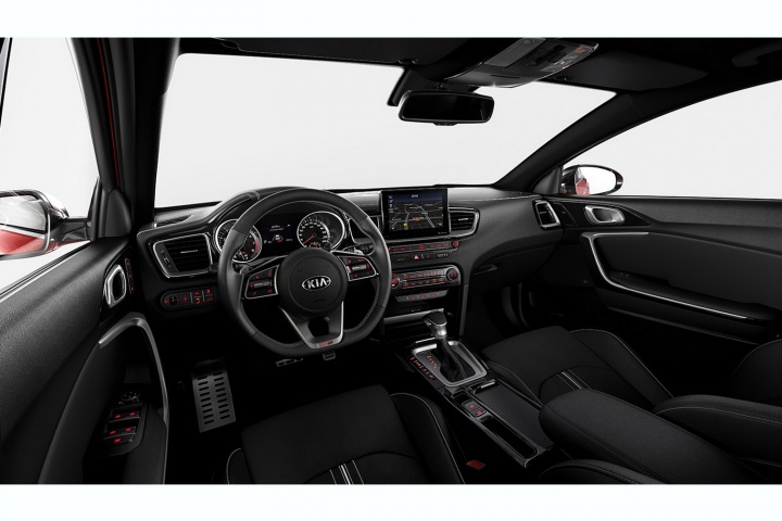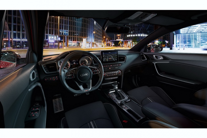 Although the core design and layout of the Kia Ceed's interior is retained for the Proceed, there are a few differences. The roof liner is black, the door sills have metallic scuff plates and there's a flat-bottomed steering wheel as standard. Cars fitted with the dual-clutch auto get metal gearchange paddles behind that wheel, too. There are several designs of sports seat offered, depending on specification, and the rear occupants sit lower down to help offset the lowered roofline.