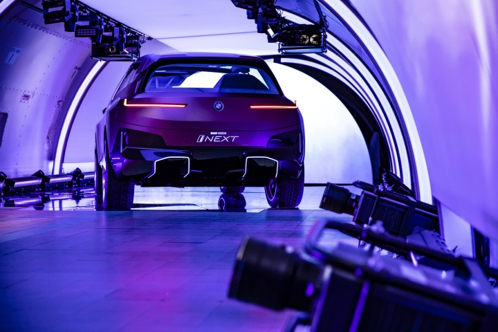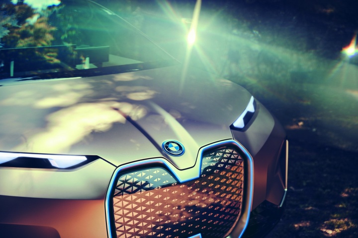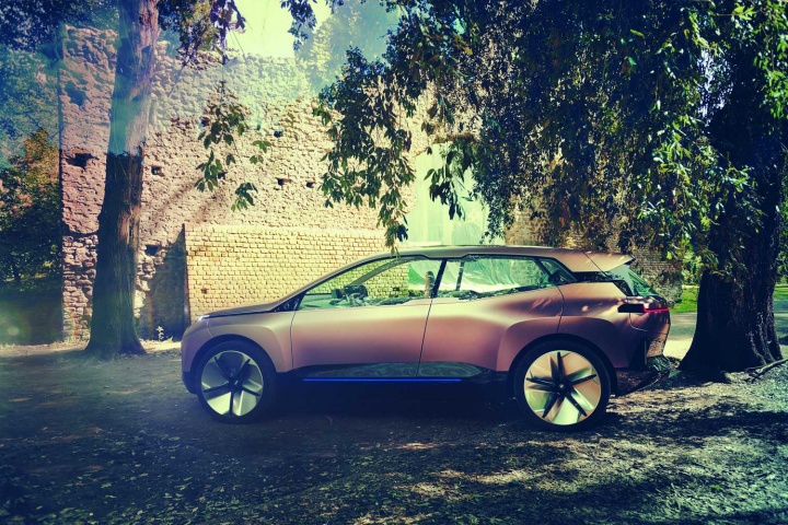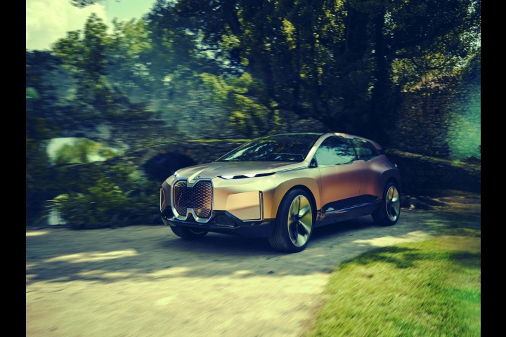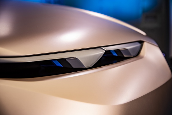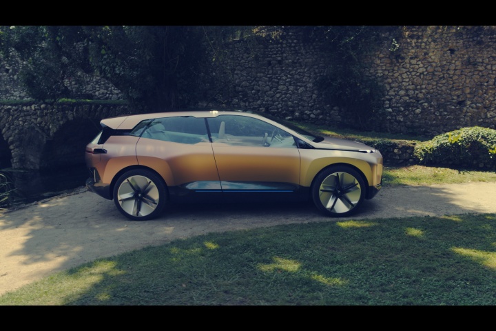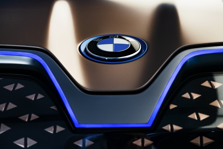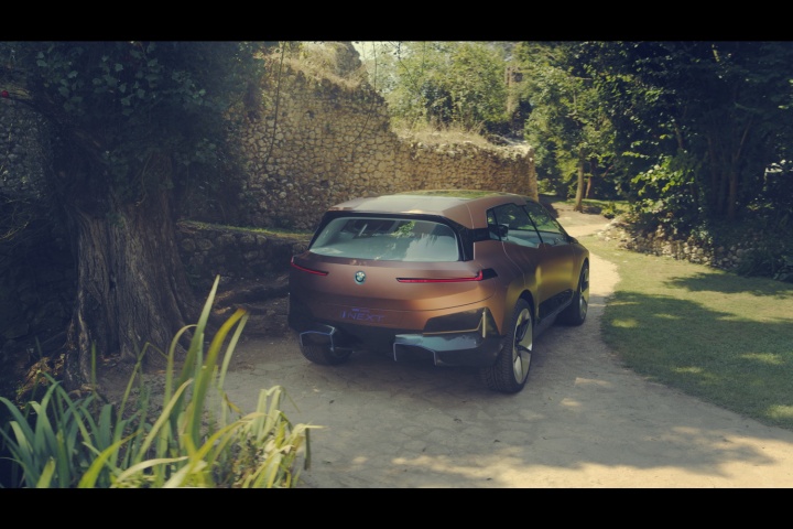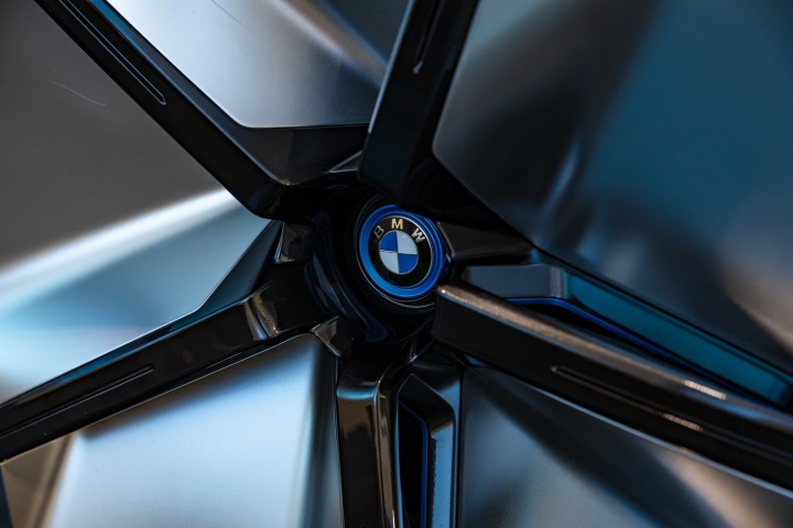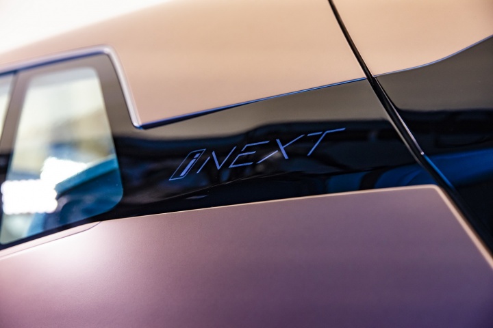 Which means we're back to the aesthetics and the technology fitted to this plane-bound concept. On the former score, once you've got past the shock of the iNext's startling face, it's actually quite an attractive thing to behold. The concept car is finished in natty paintwork that starts off copper at the front of the BMW and segues neatly to rosé by the time you've reached the rear, some five metres later. On a whopping set of aerodynamically optimised 24-inch alloys, the iNext certainly has presence - and no small degree of 'wow' factor when the doors (which open in opposing directions) swing out with just a sweeping hand gesture near their pillarless join. The sides of the iNext are refreshingly free from numerous swage lines, instead going for a softer, smoother look, and round the back there's an enormous diffuser (that for a moment tricks you into thinking the car has exhausts, for no good reason) that promotes optimum airflow, while slender light clusters and a spoiler lend the BMW EV SUV a sporty air.