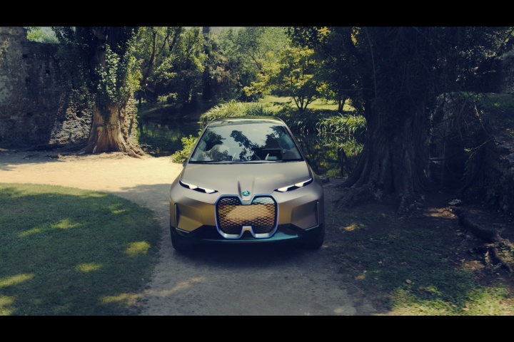 Then, the video starts to show the car, obliquely at first; glimpses of its wheel here, a smidge of its front wing there. Before the camera finally focuses square-on to the nose of the BMW, still silhouetted... and then the large, semi-circular panel descends, and the lights come up on the real thing. And... wow. You have to draw breath. Because the Vision iNext is... somewhat challenging in the facial features department. There has been a progression in size of BMW kidney grilles over the years, to the point that they're simply gargantuan on the impending X7 flagship SUV. But even those nostrils don't match the one-piece appendage on the front of the iNext.