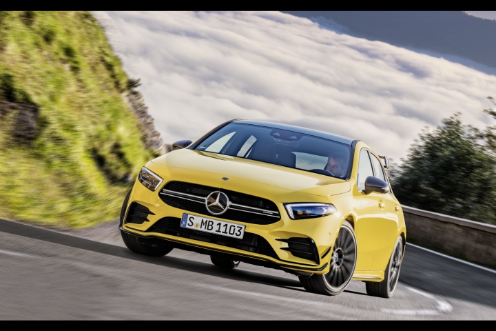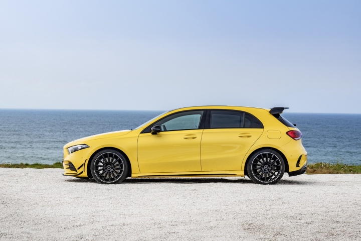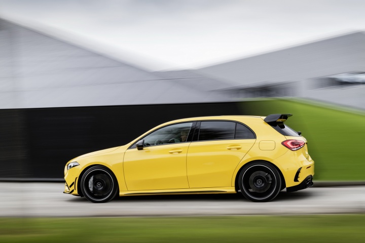 The Mercedes AMG A 35 doesn't need the bright yellow paintwork of the car pictured to stand out, as it promises to be every inch the AMG hot hatch in appearance. Saying all that, we suspect that you're looking at a version with larger optional alloy wheels (they're 19s) and perhaps an additional black-themed styling package, as AMG talks about the standard car featuring 18-inch rims and chrome trim up front. That large roof spoiler is unlikely to be standard too, which is great news, as those that want to stand out can specify their A 35 as shown, while the rest of us can enjoy less attention - and presumably better ride comfort - by sticking with the standard specification.