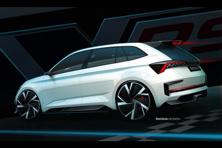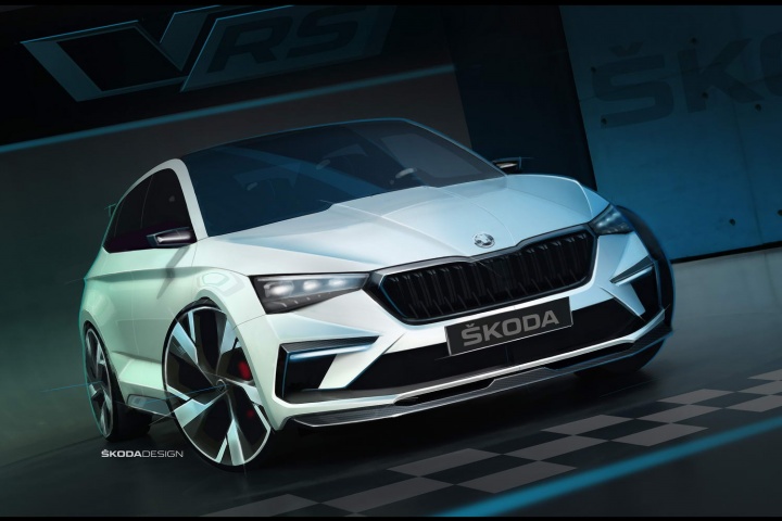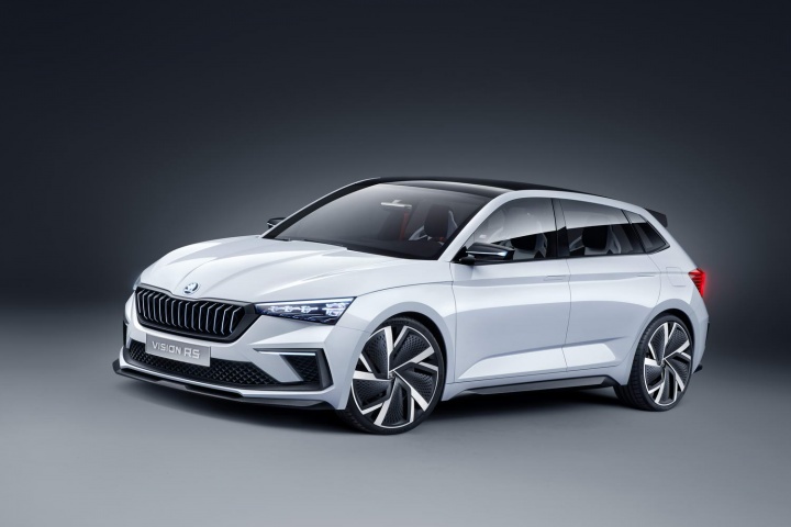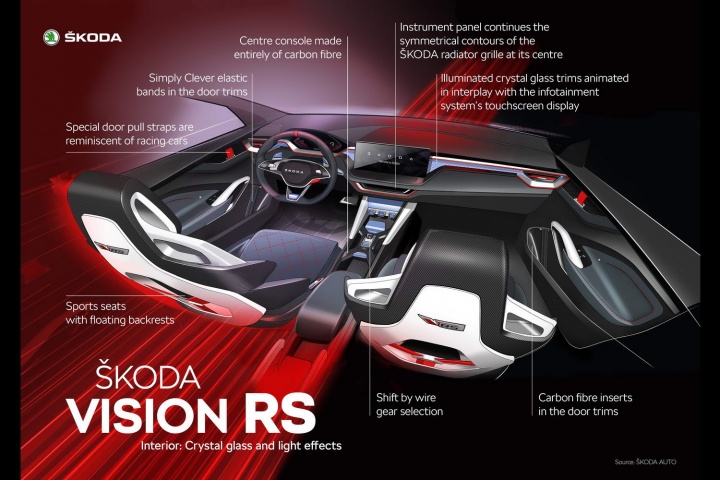 The show car, previewing a new Rapid that aims to be able to stand tall with its distant stablemate, the Volkswagen Golf, is finished in xirallic crystal sparkle-effect white paint, which gives the Vision RS a slightly blue hue. Organic components in the paint reflect heat, reducing the interior temperature of the car. The white finish is contrasted by numerous carbon-black elements, while the Vision RS has a sporty front grille and a mean-looking rear to emphasise its performance credentials.