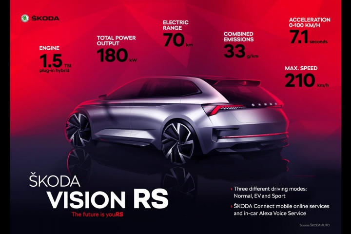 The Paris show car is powered by a 1.5-litre TSI unit, delivering 150hp, augmented by a 75kW electric motor (102hp) that combines with the petrol engine to give an overall output of 245hp. In a C-segment-sized hatchback, that means a 0-100km/h time of 7.1 seconds and an 80-120km/h time of 8.9 seconds, figures potent enough that Skoda will launch this plug-in hybrid electric vehicle (PHEV) with its racy 'RS' badging.