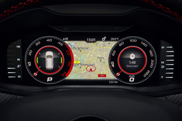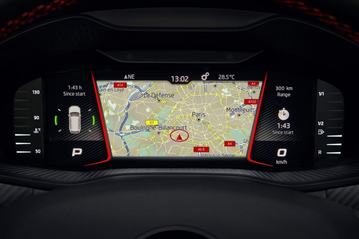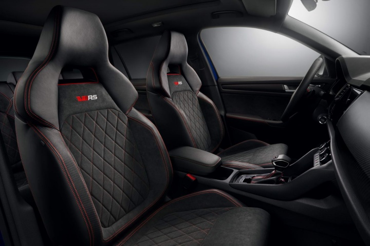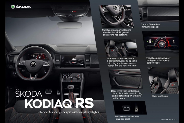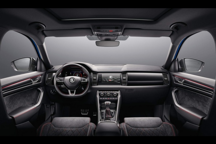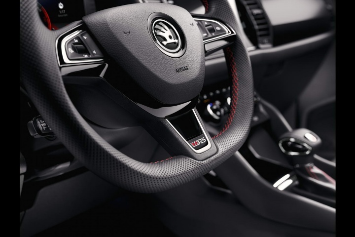 In keeping with the RS heritage of Skoda, the Kodiaq RS has aggressive exterior styling. LED headlights, 20-inch alloy wheels, specific RS front and rear bumpers, a glossy black front radiator grille, black roof rails, sunset tinted rear and side windows, while black window frames complete the sporty road presence. Inside, the sports seats are decorated in Alcantara suede with specific RS stitching and are electrically adjustable. The Virtual Cockpit customisable electronic instrument cluster will also come as standard while aluminium pedals, Alcantara door panels and carbon styled decor complete the sporty interior.