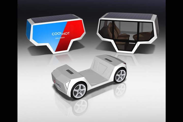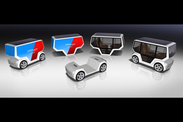 The Micro Snap takes the basic idea - of separating the powertrain and batteries into a 'skateboard' - and shrinks it down, to roughly the size of a Renault Twizy. Onto that platform, you can then load a body that's either a refrigerated or heated delivery cube, for food transportation for instance, or a two-seat 'taxi' body for short urban journeys.