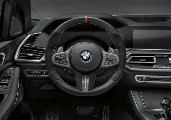 You can jazz up the inside with M Performance parts too, including a new, sportier-looking steering wheel which comes with Alcantara grips, and a red indicator stitched in at the 12 o'clock position (so that you can more accurately apply opposite lock when drifting your X5, of course...). You can also add carbon-fibre trim to the steering wheel, and even the manual gearshift paddles can be swathed in a carbon-effect cloth.