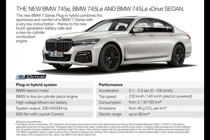 As already stated, the main news here is that the 2.0-litre petrol engine - which formerly provided the combustion-powered propulsion in the superseded 740e - has been replaced with a 3.0-litre inline-six. BMW will offer this hybridised drivetrain in three distinct models: as the short-wheelbase, rear-wheel-drive 745e; as the long-wheelbase, rear-wheel-drive 745Le; and with the same long body, but now with the addition of all-wheel-drive security, in the 745Le xDrive.