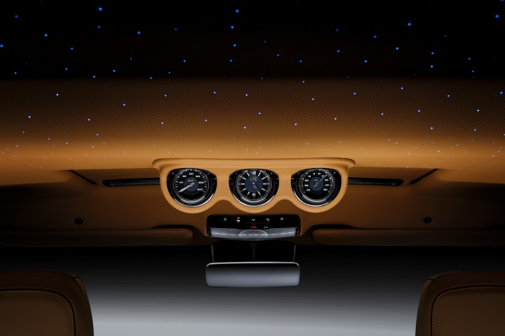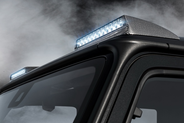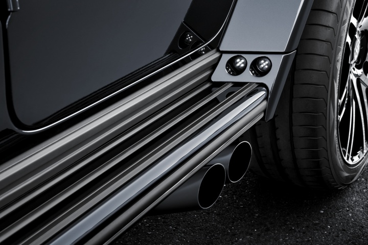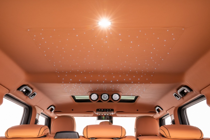Style-wise, the Widestar lives up to its name by having massive, flared wheelarches, wrapped around 23-inch rims, that add 40mm to the overall width of the G-Class. There's also a cavernous front bumper air intake, a massive, nostrilled, power bulge on the bonnet, and sidesteps with built-in LED lighting. Y'know, for subtlety. It even gets piercing LED roof lights (perfect for muscling slower cars out of the fast lane on the Autobahn) and a unique Brabus interior with a 'Starry Sky' headliner filled with tiny LED lights.