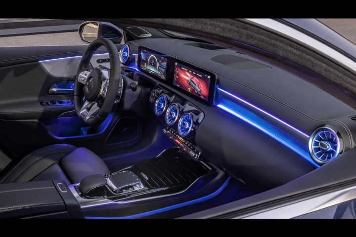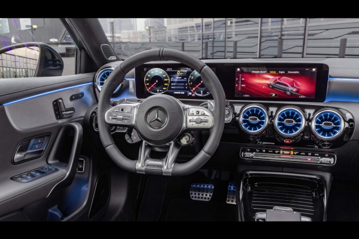 As with the regular A-Class Saloon, the A 35 is claimed to be at the top of the sector in terms of rear seat space, and its boot holds the same 420 litres. Up front, the MBUX infotainment system dominates the dashboard with a widescreen design. The A 35 gets three AMG-specific instrument layouts, including one called Supersport. The standard AMG steering wheel has a flattened section and perforated leather in the grip area with red contrasting stitching and metallic gearchange paddles behind. The intuitive thumbpads on the spokes of the steering wheel are included.