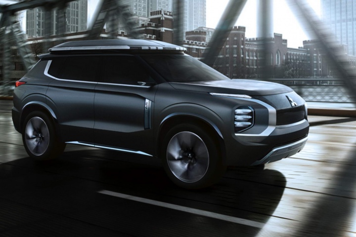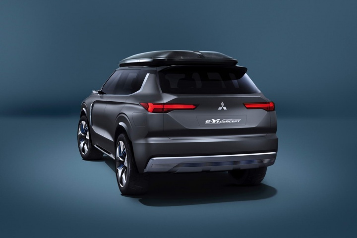 Style-wise, the e-Yi-Engelberg gets a massive, quite dramatic face which uses a variation on Mitsubishi's current 'Dynamic Shield' face, which chrome sections that light up blue when the car is charging. It's also a seven-seater, which means Mitsubishi has improved the packaging compared to the current Outlander, which sacrifices the folding third row because that's where the batteries and rear electric motor go.