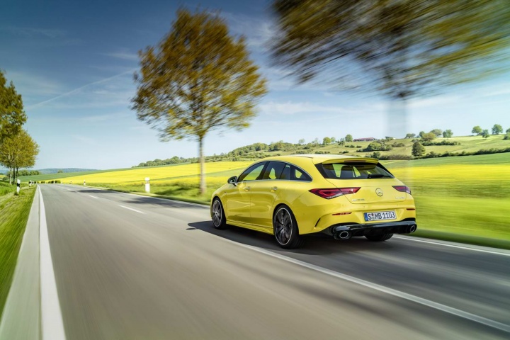 Powering the CLA 35 Shooting Brake is the now-familiar 2.0-litre four-cylinder turbocharged engine, delivering 306hp at 5,800rpm and 400Nm from 3,000-4,000rpm. This is sent to all four wheels via a seven-speed AMG Speedshift dual-clutch automatic transmission. With the full array of drive modes, including a standard 'Race Start' function for the quickest possible launches, expect the CLA 35 Shooting Brake to hit 100km/h from rest in 4.9 seconds and run on to the usual 250km/h limiter with little difficulty. Emissions are 168-171g/km, although a combined fuel economy figure is yet to be announced. Stopping power is provided by four-piston front brake callipers gripping 350mm discs, with single-piston callipers and 330mm discs on the rear axle. An AMG Sports exhaust is standard fit, while options will include three-stage adaptive dampers under the AMG Ride Control banner.
