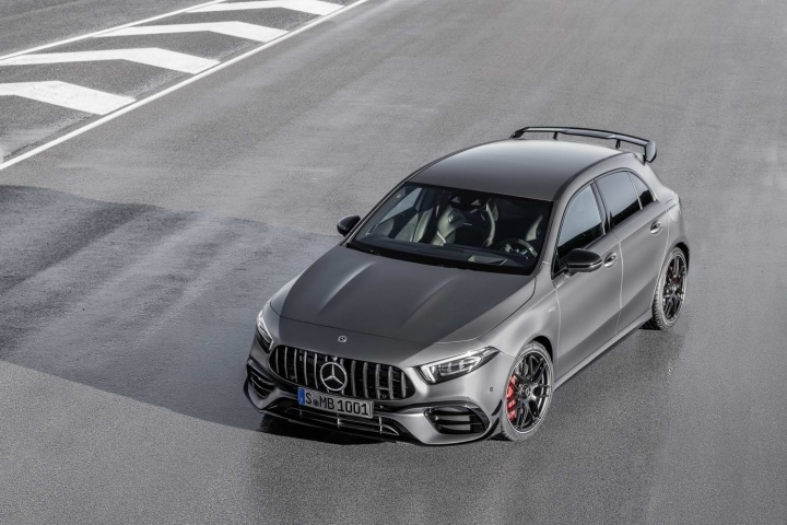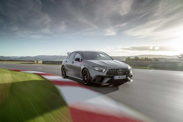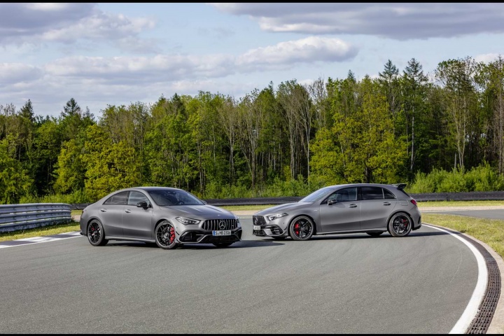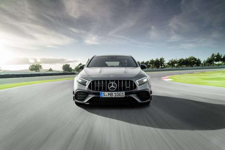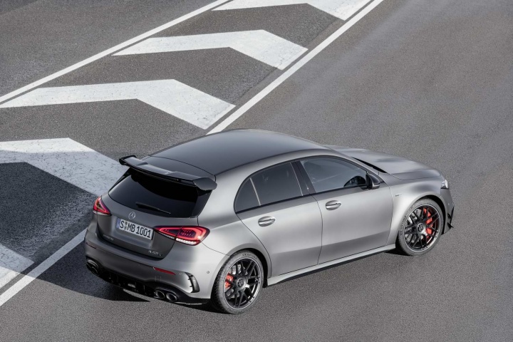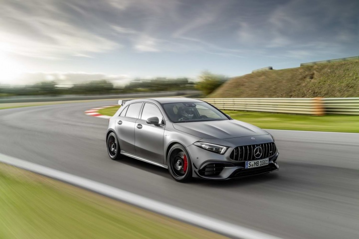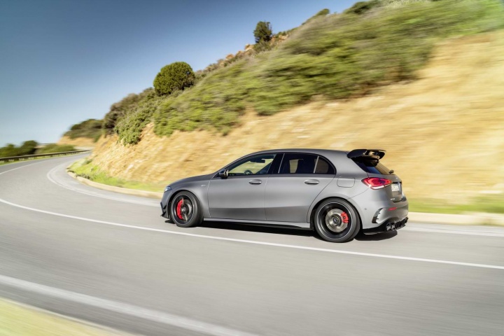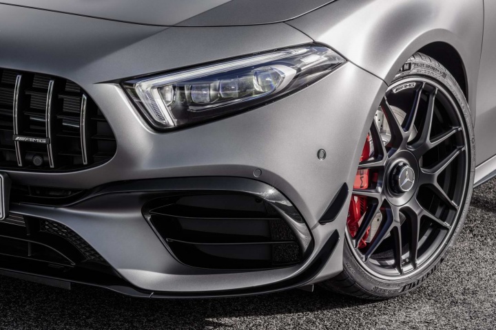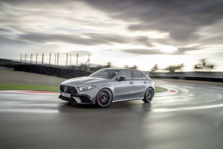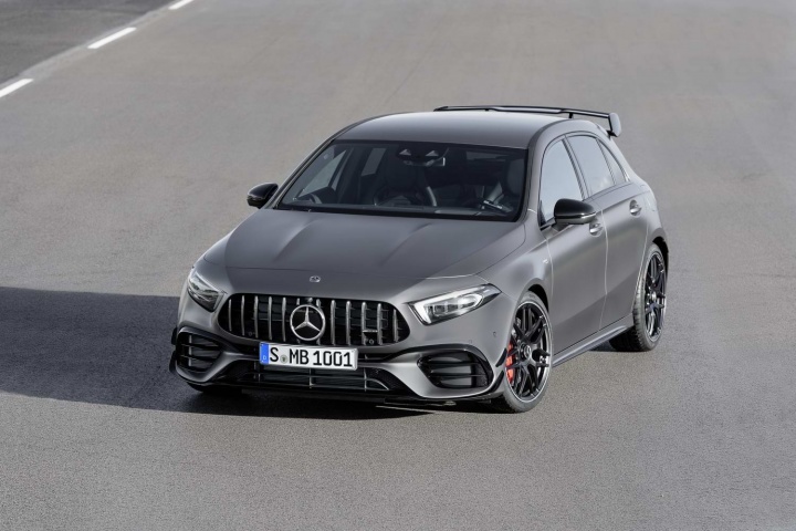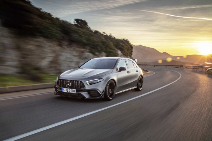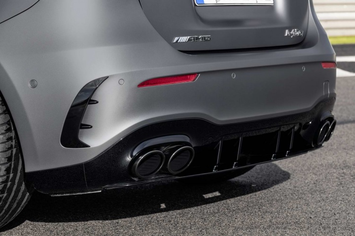 There are actually four '45s' being released here: the A 45 and CLA 45, and then the A45 S and CLA 45 S. All of them use a new 2.0-litre four-cylinder turbocharged petrol engine, which is more powerful than the preceding A/CLA 45 models, even in its lower specification. Here, it delivers 387hp and 480Nm, which - driving all four wheels through 4Matic+ all-wheel drive and a new eight-speed AMG Speedshift dual-clutch automatic - will see the A 45 hit 100km/h from rest in 4.0 seconds flat, while the CLA 45 is just a tenth behind at 4.1 seconds. But the A 45 S and CLA 45 S deploy the 421hp/500Nm iteration of the same powerplant, trimming their respective 0-100km/h times by a tenth of a second... yes, that means the A 45 hot hatch will run the benchmark sprint in less than four seconds, knocking in a ridiculous 3.9-second time. The 387hp 45s are limited to 250km/h, with an option to lift that to 270km/h with the AMG Driver's Package, while the 45 S twins are pegged to 270km/h as standard.