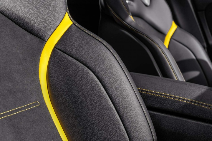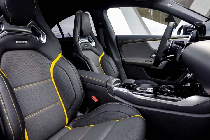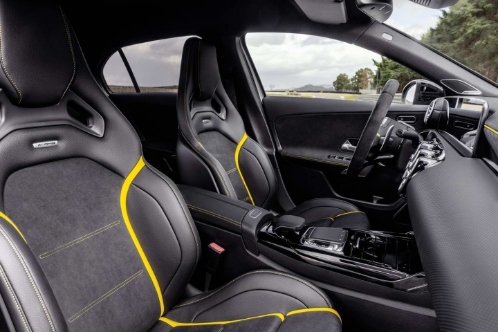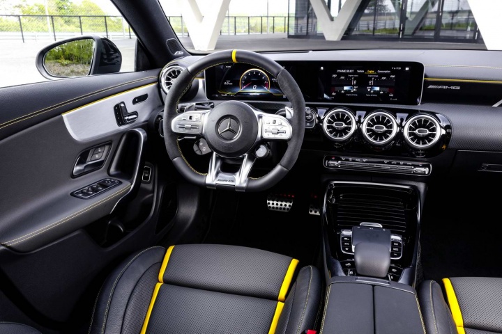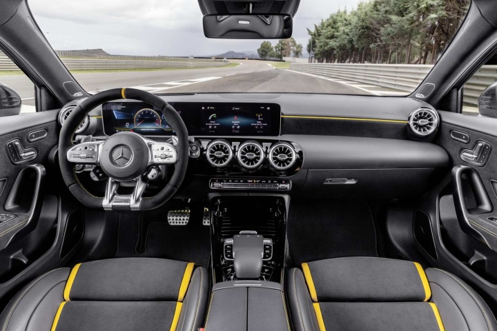 Like the 35 models, the 45 quartet enjoy the current A-Class/CLA-Class cabin, complete with the full MBUX infotainment system, only the interior has a sportier air. This is mainly because of a combination of Artico man-made leather and Dinamica microfibre with red topstitching, red Designo seatbelts and a red border for the upper dashboard; however, all this red is replaced with yellow in the higher S variants, while an AMG Performance steering wheel in Nappa leather and Dinamica - plus a 12 o'clock marking - is included. Various AMG-specific displays can be called up on the MBUX system, with things like a G-Meter and Race-Timer part of the package.