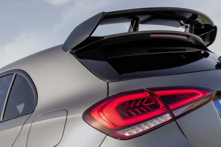 With the A 35 and all its 306hp derivatives already loitering in Mercedes-AMG's compact cars portfolio, the German powerhouse had to pull out all the stops for the A 45 and CLA 45. Although... we'd say it'll take a bit of an AMG anorak to spot the main differences. In terms of the rear spoiler perched on the boot, the front lower airdam and the beefy side sills, the A 35 and A 45 are hard to tell apart. What marks out the more powerful variants are a pair of power strakes on the bonnet, as well as AMG's Panamericana grille, which features 12 vertical slats, whereas the A 35 has twin horizontal louvres up front. The eagle-eyed among you might also have noticed that the newcomers have flared front wheel arches, something the 35 family does not. An easier spot is round the back: the full-fat AMG has quad exhausts, the A 35 has just a pair of spaced circular tailpipes. There's even a difference here between the non-S and S models of the new A/CLA 45 models, as the more powerful versions have 90mm-diameter exhaust tips with internal fluting and external lettering, as opposed to the regular models' 82mm items.