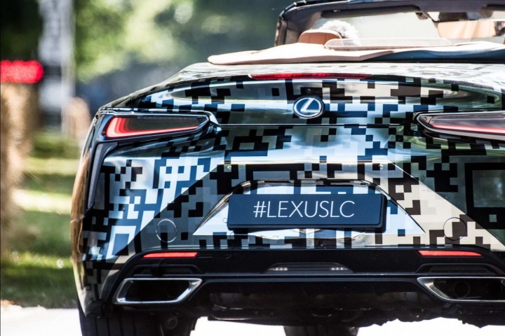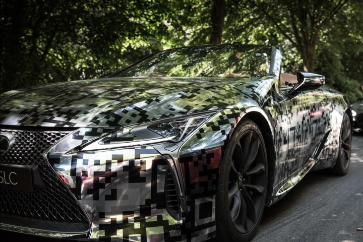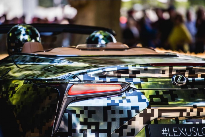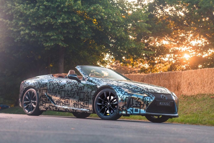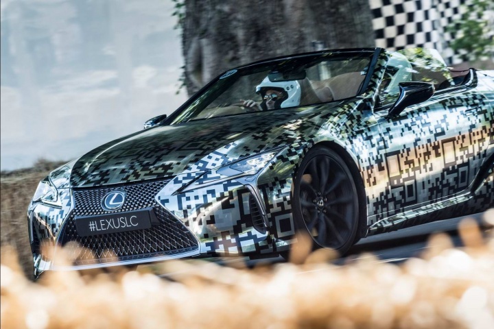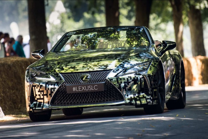 Lexus has shown off a prototype, clad in sparkly camouflage, of its new LC convertible. Being ragged up and down the hill at the Goodwood Festival of Speed is now a commonplace form of reveal for a new high performance car, but the LC will probably make more of a visual impact than most, with that chrome-finished ziggurat cladding.