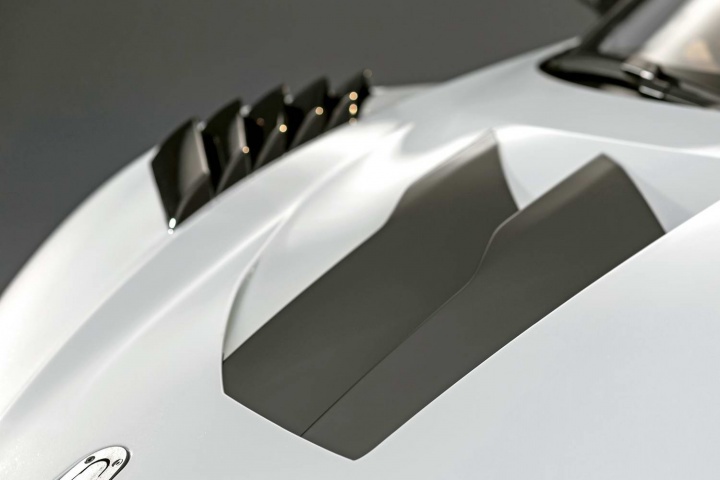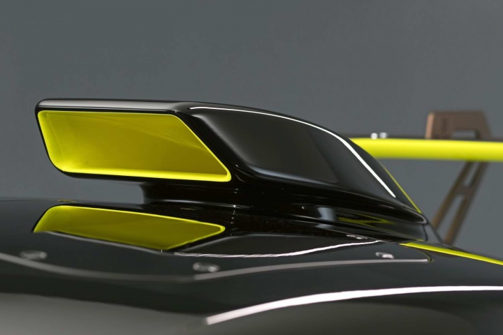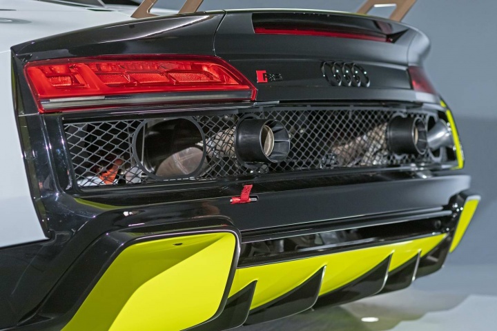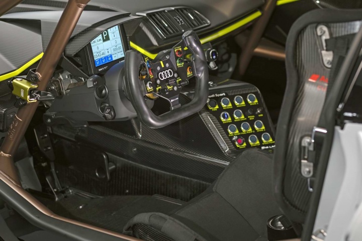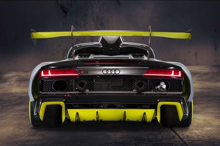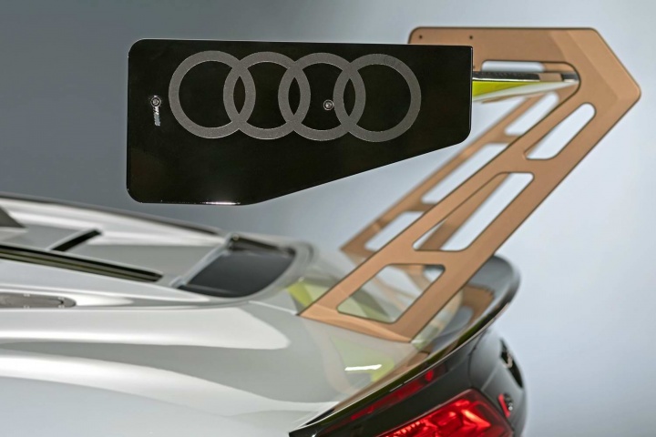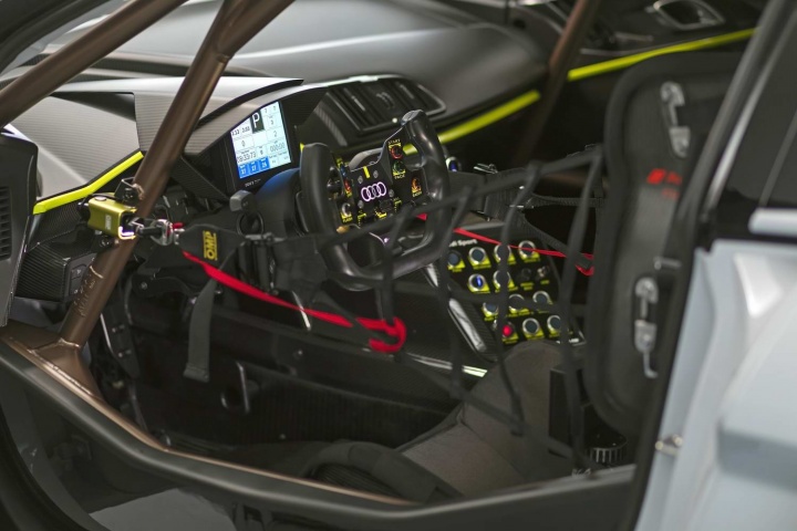 It is built using the same proportions and body as the road-going R8 Spyder but gains a unique roof with a dramatic intake scoop above. Flared arches and protruding side blades add the car's purposeful image. As there is no rear window, Audi equips the cockpit with a rear-facing camera display.