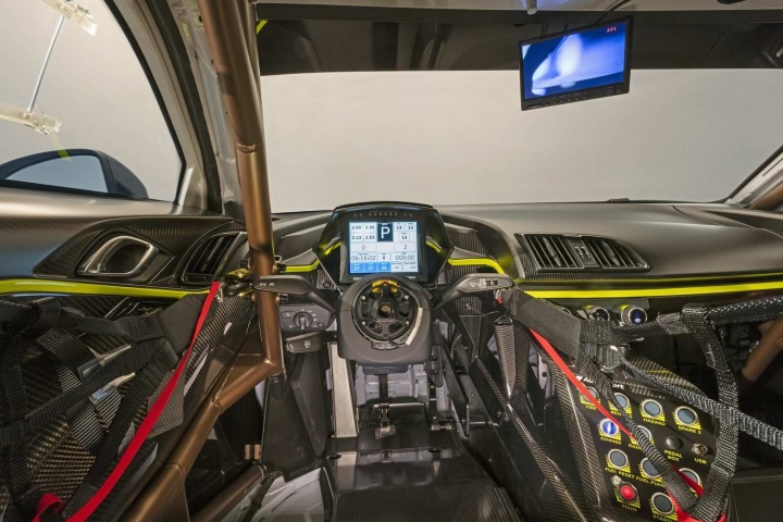 Audi provides the R8 LMS GT2 with all of the latest safety equipment to protect the driver and car. The Audi Protection Seat PS 3 surrounds the driver and features safety nets on either side in addition to the FIA-approved six-point harnesses. It has the same safety fuel cell as the GT4 version plus a 15-litre catch tank with a fill level sensor. Buyers can also specify a quick refuelling valve for endurance racing. A rescue hatch integrated into the roof facilitates access for the extrication team in the event of a serious accident, allowing the removal of the driver's helmet safely to apply the Kendrick Extrication Device to stabilise them.