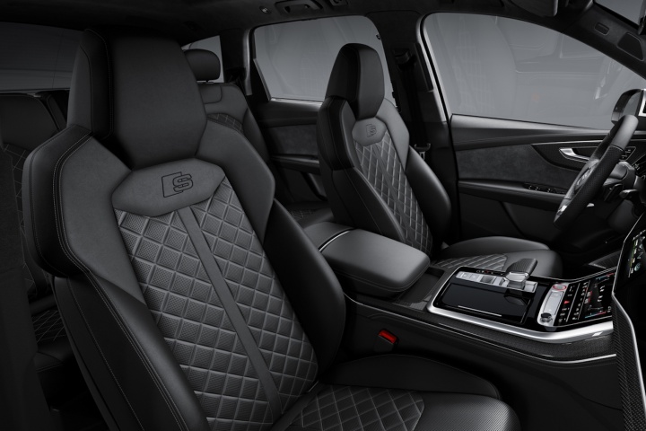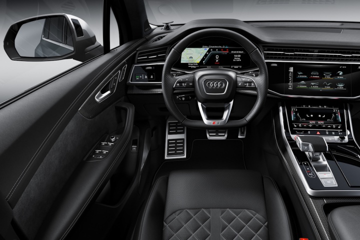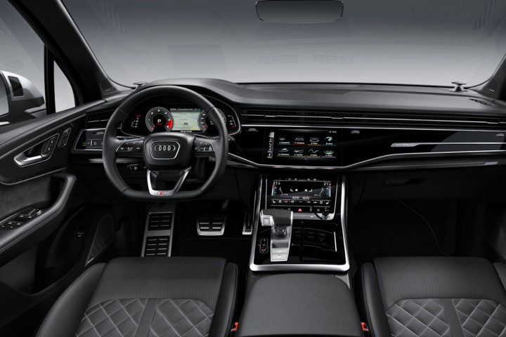 Inside, there's a much easier 'tell' for the update SQ7, and it's the three-screen MMI Navigation Plus layout seen in the latest high-end Audis. Gone is the old pop-up unit sitting atop the dash and a rotary MMI controller on the transmission tunnel, replaced instead by a couple of touch-sensitive digital displays in the centre stack and a smoother gearlever area. This change has necessitated a different design for the passenger fascia, although the full-width air vents are preserved. Other than that, it's high-class business as usual for the SQ7 2020MY, with top-end fixtures and fittings, loads of tech and the ability to seat seven people within.