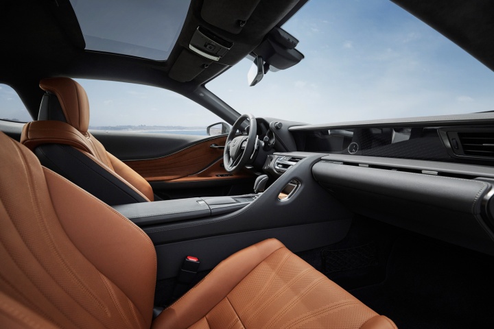 The interior is a two-tone affair, defined by the aniline leather seats which are finished in Bespoke Saddle Tan (both this colour and the Terrane Khaki paint are exclusive to the LE models of the LC range) and which contrast with darker Alcantara trim on the doors for a most pleasing ambience. Black Amber leather is used for the steering wheel, dashboard and centre console, and the whole lot is set off with brown stitching.