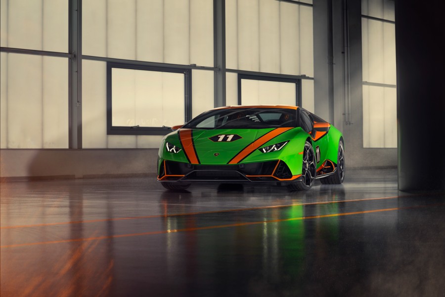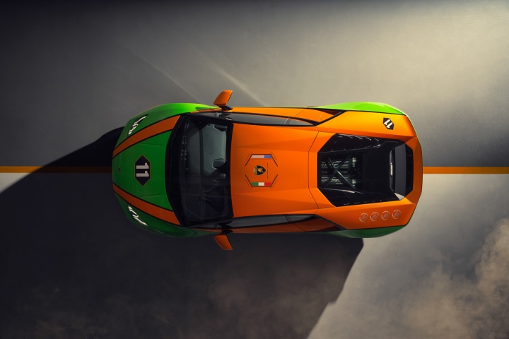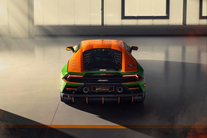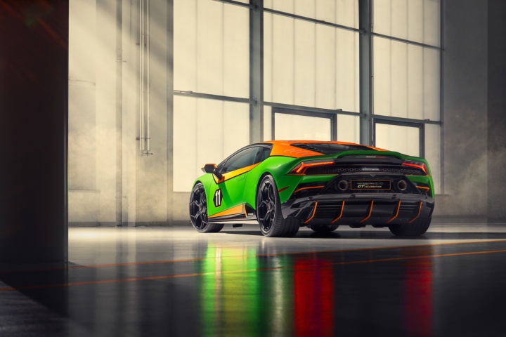 Being a tribute to the GT3 Evo which triumphed at the American races, the design of the car evokes the livery of the GRT Grasser Racing Team, which (along with Paul Miller Racing) brought the company the four victories. So the car is finished in Verde Egeria green and Arancio Aten orange, while another three colours for body and three colours for the livery means there are nine total combinations for the GT Celebration.