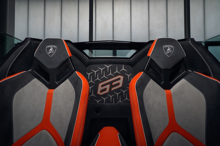 Inside, three colour schemes in Alcantara, featuring carbon-fibre highlights, are complemented by Lamborghini's patented lightweight 'CarbonSkin' material. There's a limited plaque on the steering wheel and a '63' logo etched into the rear bulkhead's Alcantara and CarbonSkin combination. The show car at Pebble Beach was finished in matte grey Grigio Acheso, set off by orange Arancio Dac details.