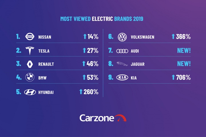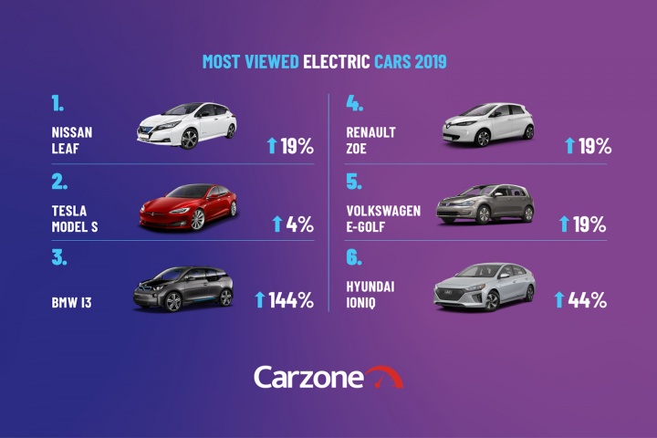 The BMW i3 takes the third-most viewed electric car in the charts, while the Renault Zoe comes in fourth. According to Carzone: "With high consumer interest in EVs, along with ambitious government sustainability plans, the demand for EVs will continue to increase in to next year, with a number of new EV launches forthcoming, including the Opel Corsa-e, Mercedes-Benz EQC, Peugeot's e-208 and the Volkswagen ID.3."