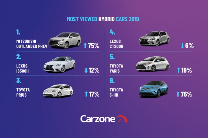 Mitsubishi's plug-in hybrid Outlander is also seeing increased interest, with page views up by 75 per cent, 63,402 in 2018 to 111,250 for the same period in 2019. That makes it the most-viewed hybrid model, followed by the Lexus IS 300h in second place, and the Toyota Prius in third.