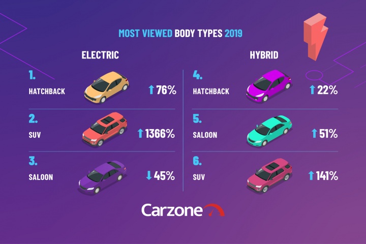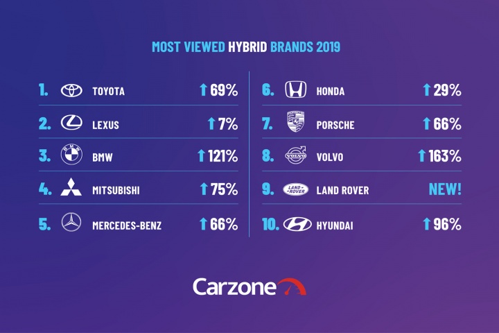 Hybrids are also gaining in popularity, and it's no surprise to find that the most hybrid-focused brand, Toyota, is currently top of the Carzone hybrid charts. The Prius Hybrid, Yaris Hybrid and C-HR top the search lists, while Lexus is the second-most searched-for hybrid brand, followed by BMW in third place.
