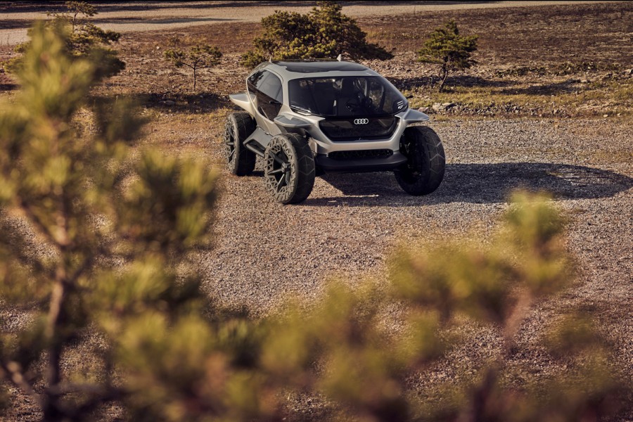 The Audi AI:TRAIL quattro has coil springs and adaptive dampers, as well as 60mm of suspension travel. This aids both off-road ability and on-road passenger comfort. Further, its tyres feature variable, sensor-controlled air pressure regulation, so the AI:TRAIL can raise or lower its tyre pressures by scanning the road surface ahead and monitoring its ESC to work out what the best amount of air in the rubber will be for any given situation.