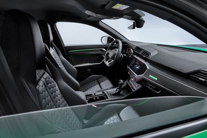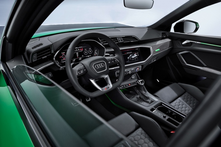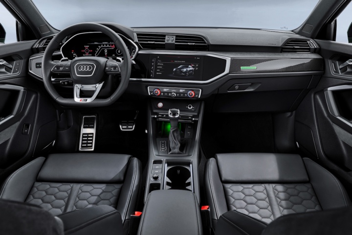 On the chassis front, the ride height has dropped by 10mm compared to the standard Q3 and Q3 Sportback. 20-inch wheels are standard, with 21-inch versions as an option. Braking is by new six-piston calipers working on special RS steel brake discs. As an option, you can have ceramic RS brakes, with whopping 380mm front discs. The S-Tronic dual-clutch automatic gearbox comes a standard.