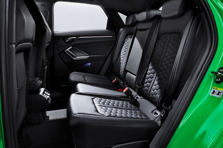 It's still a practical car, though. Audis says both Q3 and Sportback are designed to be full five seaters, and the boot is still a very generous, 530 litres. There are eight paint options - including the RS-specific colours Kyalami green and Nardo gray - and you'll tell an RS model from the outside thanks to big singleframe grille with no chrome edging, honeycomb trim effect, a deeper front bumper with 'boomerang' shaped blades, and wheelarches that have been flared by 10mm.