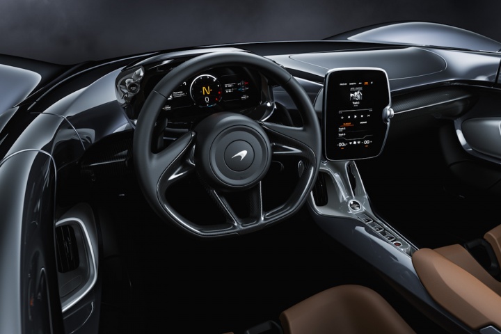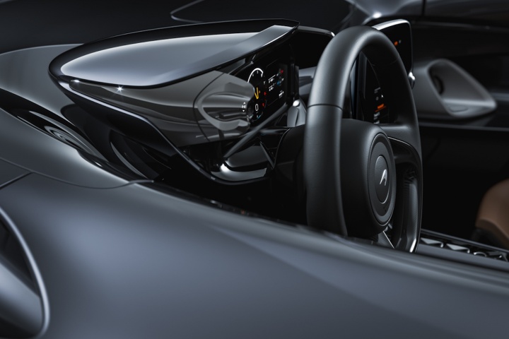 In front of the driver and passenger is an unimpeded view of the road ahead, and McLaren has striven to make sure that the bits of the car that you can see have a flowing, natural, pebble-like quality about them. The major switches and buttons are grouped on the outer edges of the instrument panel, so that the driver doesn't have to take their hands off the wheel to work them, while the eight-inch infotainment screen has a new menu layout that allows you to flick more easily between various menu functions. The system shows a range of applications on the screen, including satellite navigation, McLaren Track Telemetry, rear-view camera and climate control and is mounted on a lightweight carbon fibre arm and tilted towards the driver.